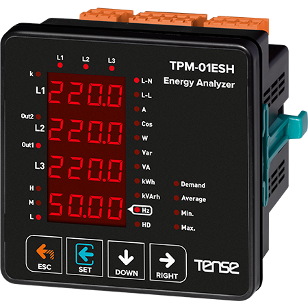 3-phase network analyzer / network analyzer / network parameter meter - Multifunctional digital panel meter, current, voltage, frequency and total power indicator, two relay outputs and digital input, RS485 ModBus RTU - TPM-01ESH manufacturer TENSE (Turkey)