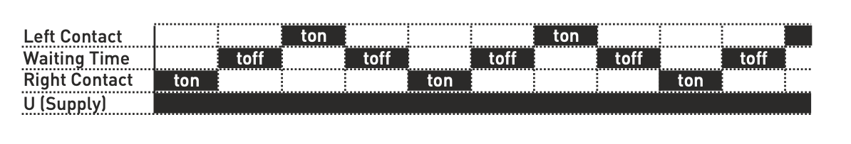 The device is designed to cycle two independent loads in "left - right", "up - down", "forward - backward" modes or to perform the reverse operation mode of an electric motor with a delay between switching (dishwasher and washing machine). You can select a time between 0.1 seconds and 100 minutes for both "Ton" and "Toff" modes.