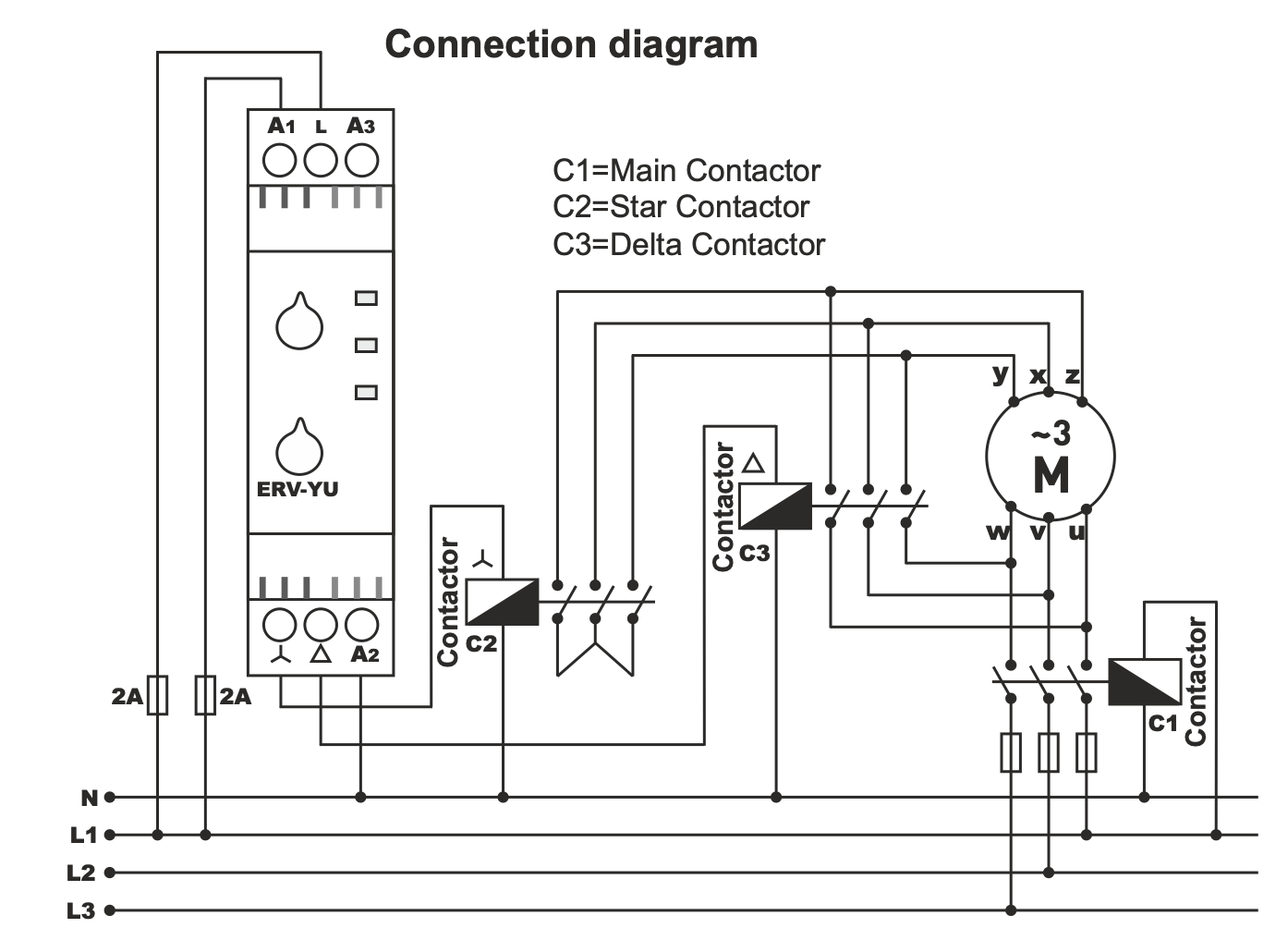 Automatic star-delta switch - star-delta time relays are designed for use in the initial start of three-phase motors. When the coil is energized, it switches to star connection to allow the motor to start. The star remains connected for a set time and then goes into standby mode. After the waiting time, it allows switching to delta connection. Thus, it provides efficiency by reducing the current drawn by high-power motors during start-up.