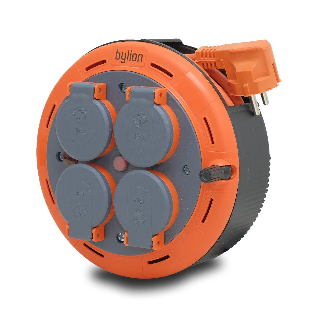 Cassette compact extension cord for household use, 5m, 4 sockets with USB and overload protection, phase indicator, child fuse, 10A 230V SCHUKO type grounding , 3x1mm2, IP20, Bylion